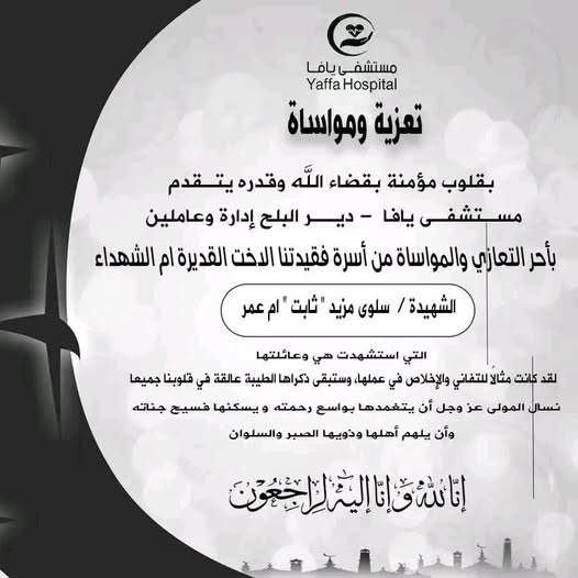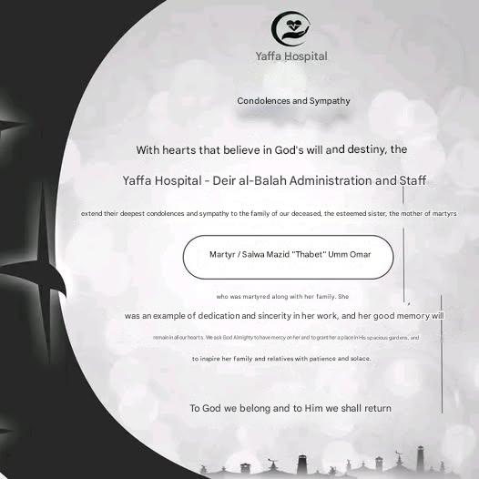 A photograph of Salwa Mohammed Mohammed Mazid and her daughter Hanan Jamil Abdul Qader Mazid together showed them embracing outside a building. Hanan, in a green dress and light-coloured hijab, killed her mother on the head, while Salwa, wearing a navy blue dress and hijab, held a bouquet of flowers. Sohaib stands in front of them. Colleagues from Yaffa Hospital in Deir al-Balah expressed condolences for Salwa and her family. She was described by her daughter as someone who had “never hurt anyone.”