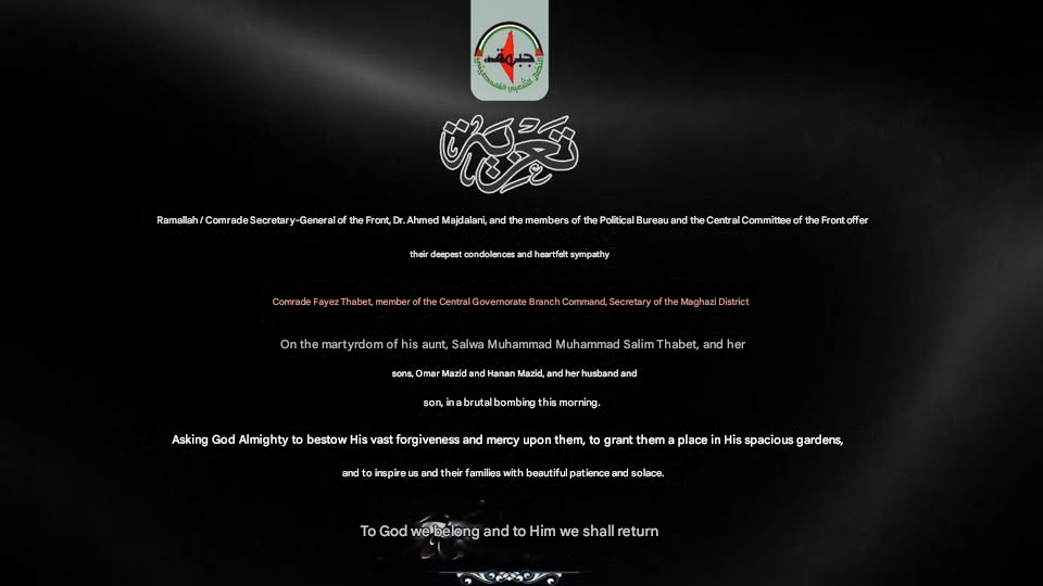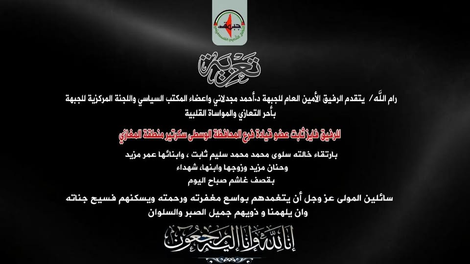 Sources, including Safa News, @AsmaaKhSalman1, and multiple family members, confirmed the names and relationships of those killed in the strike. Among the victims were Salwa Mohammed Mohammed Mazid “Thabit”, a 52-year-old mother; her 28-year-old son, Omar Jameel Abdel Qader Mazid; her 24-year-old daughter, Hanan Jamil Abdul Qader Mazid; Hana’s husband, 35-year-old Muhammad Suleiman Ali al-Diraawi; and their six-year-old son, Sohaib al-Diraawi. According to the Facebook post by Marwan Mazyad, Omar’s wife and daughter were also killed in the strike, but other sources did not mention that. Their names and ages are unknown at the time of writing.