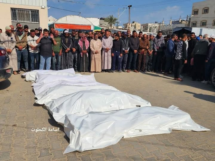 A widely shared image posted by Muhammed Shaqoura Abu Salama showed five white body bags lined side by side on the ground, surrounded by a crowd of mourners. The post referred to “my aunt Umm Omar #Mazyad and her sons and grandchildren,” confirming the family connection and the generational loss. The image was described with reverence and grief, capturing the communal mourning.