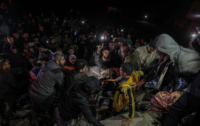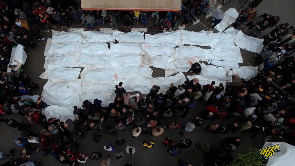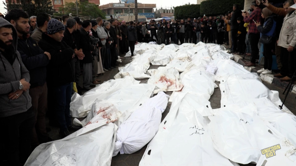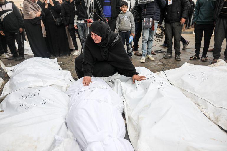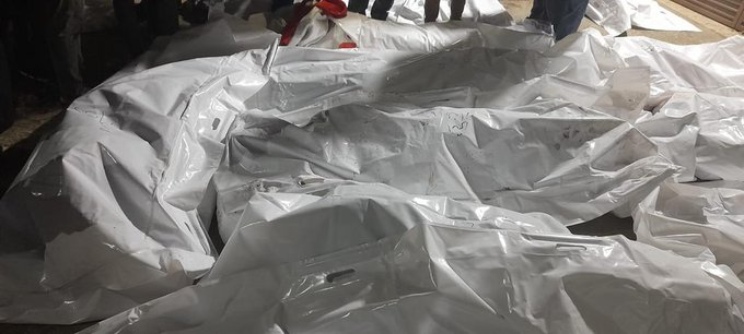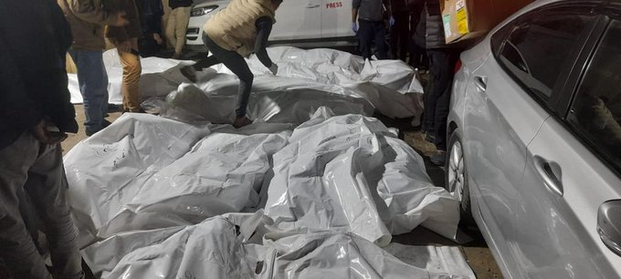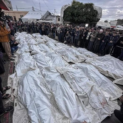Al Jazeera Palestine shared a Facebook video also showing dozens of bodies in white shrouds with the inscription “68 martyrs from one family”. The video showed a man lying on the ground, embracing a dead body of his loved one.