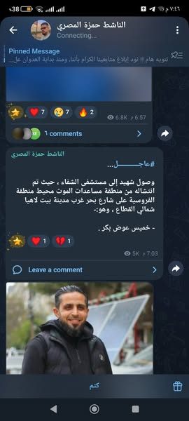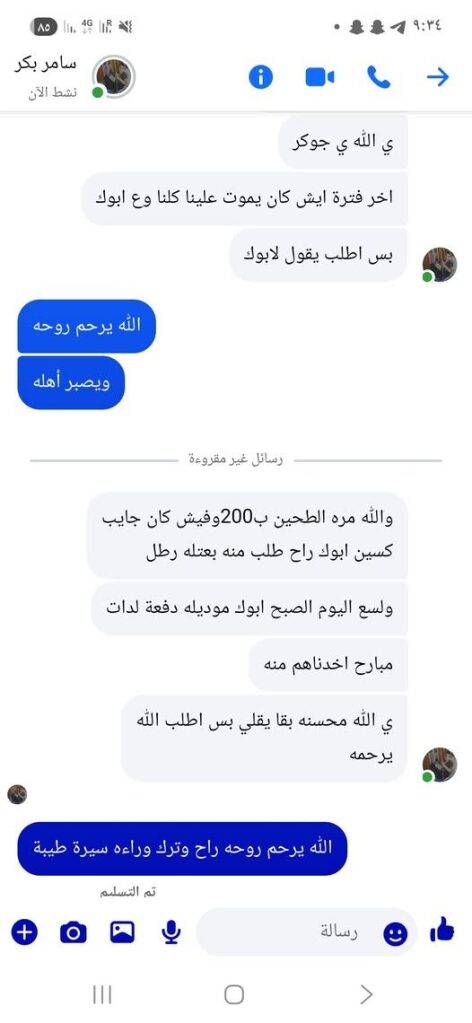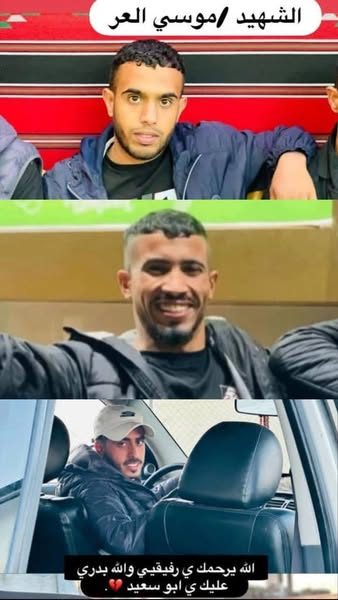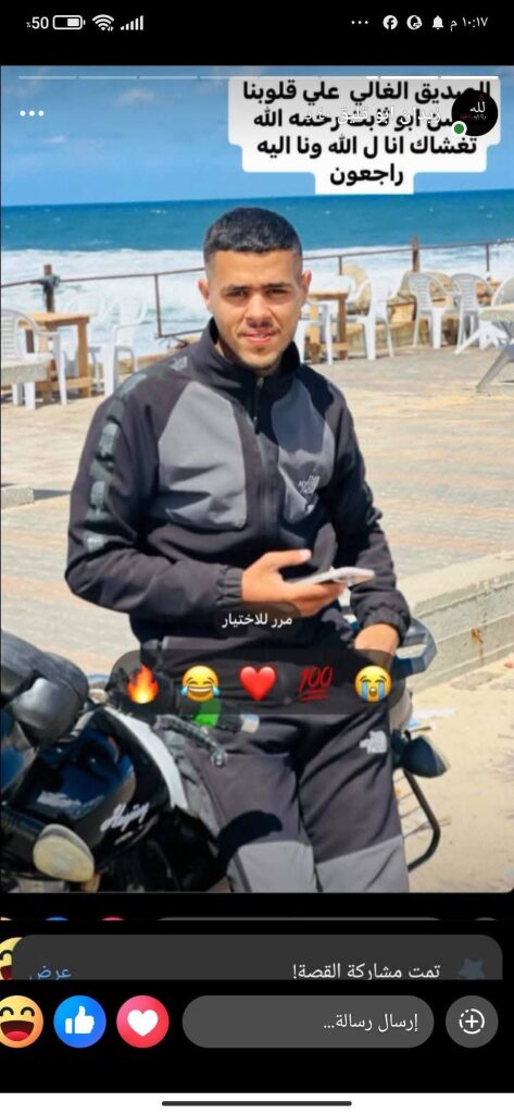 The death of Musa Muhammad Al-Arr was mourned in the Facebook post by Hossam Al Hindi, who wrote, “The martyrdom of our sincere and trustworthy friend, Musa al-Ar, and we do not vouch for anyone before Allah.” He added the image of the late Musa, a young man with short curly hair, dressed in a black T-shirt and a blue jacket.