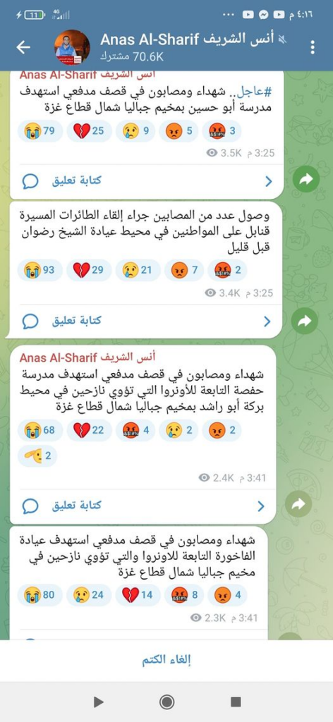 Additionally, a Facebook user, Um Al Moatsem, reported on the strike by sharing a screenshot of a WhatsApp group chat with journalist Anas Al-Sharif, who provided updates on the strikes in Jabalia Camp on October 20, including the attack on Hafsa School, which also mentioned injuries.