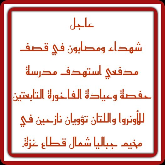 Shortly before 3:41 PM on Sunday, October 20, 2024, at least two people were killed and four people injured as a result of an alleged Israeli artillery strike on the Hafsa School, affiliated with UNRWA. The school was serving as a shelter for displaced people and is located near Abu Rashid Pool in Jabalia Refugee Camp, north of the Gaza Strip.