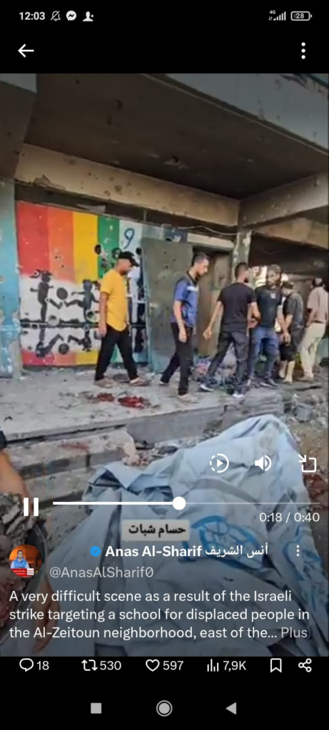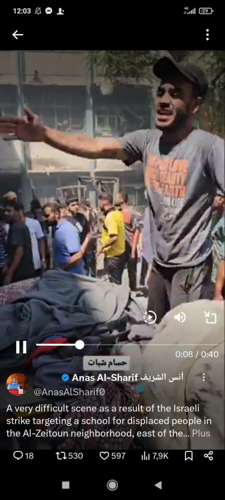 Twitter/X user @AnasAlSharif0 and @Hakeam_ps reported the strike at 10:45-10:53 AM, writing about deaths and injuries amongst civilians. At 12:52 Safa News Agency’s correspondent also reported the strike, noting that it led to the death of 20 civilians. At 13:38 Safa, referring to the Civil Defense, updated the information: “20 martyrs, including 13 children, 6 women and a fetus, and nearly 30 injured, including nine children with amputations, as a result of Israeli shelling of the “Al Zeitoun C” school, which houses thousands of displaced people in the Al Zeitoun neighbourhood, south of Gaza City.”