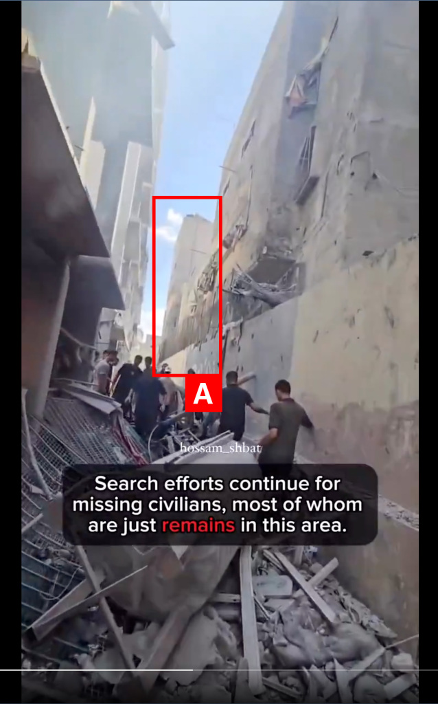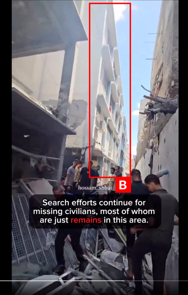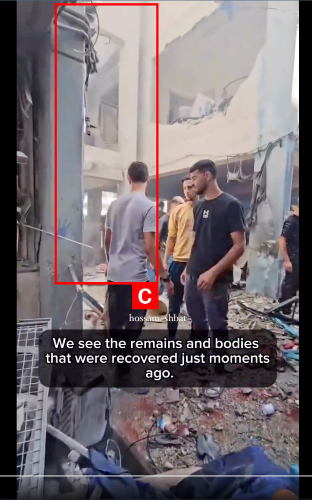 Two prominent Palestinian reporters, Anas al-Sharif and Hossam Shabat both reported from the complex on September 21. Airwars’ geolocation team confirmed that videos from both Anas and Hossam were filmed at Al-Zeitoun C School. In the videos, shared at 4:19 PM and 4:20 PM respectively, Anas referred to the site of the strikes as Al-Zeitoun C school, and Hossam referred to the site as Al-Falah school.