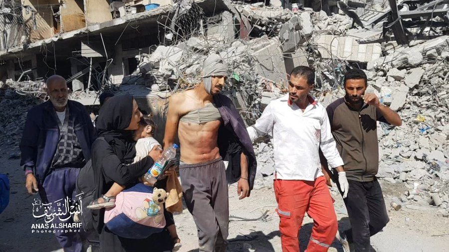 Three other images shared by Anas al-Sharif in the same post show civil defense members escorting an injured man and his family through the road. In two others, a civil defense member pulls an empty, orange stretcher along the ground.