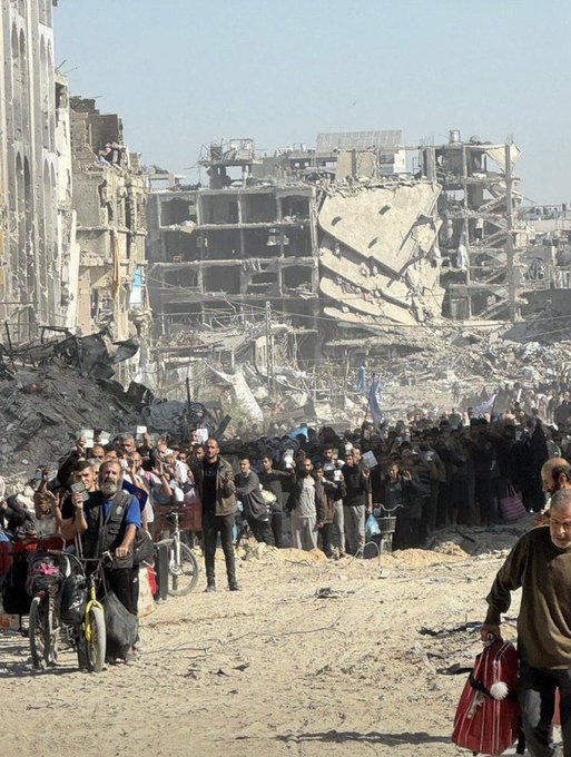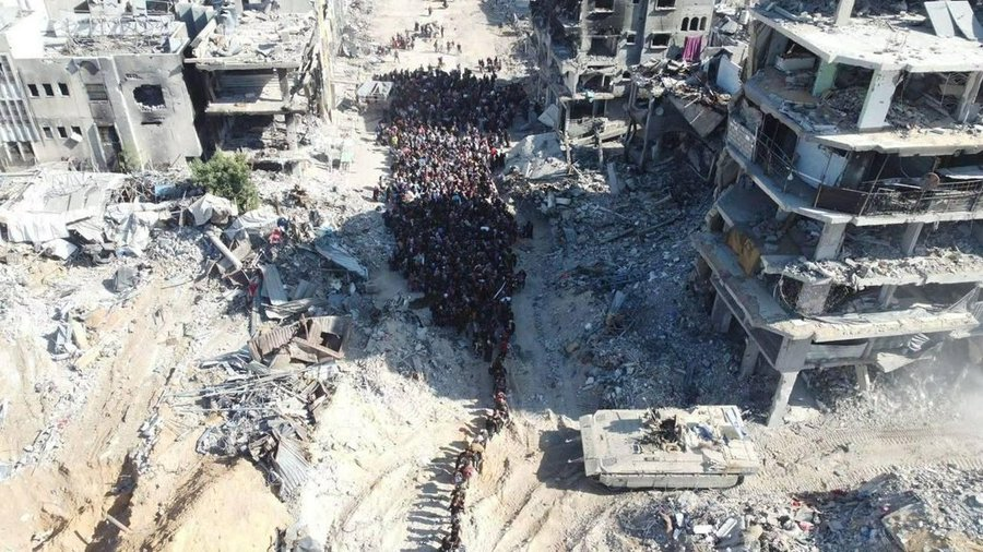 Accompanying The Independent – Arabiya article, cited above, is a 32 second video, captioned “drone shows hundreds of displaced people in Jabalia.” The video, taken from above, glides over a long line of people standing in a road in daylight. They are surrounded on all sides by intense destruction. An Israeli tank, identified by an Israeli flag flying off the back, appears to monitor the line of people.