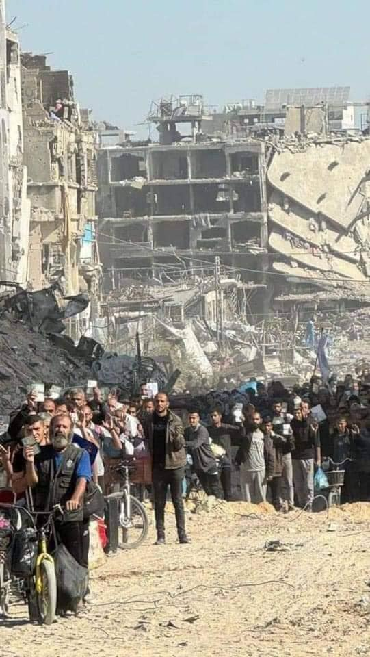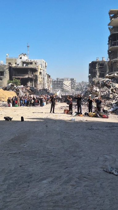 A post shared by Amira Dobia to Facebook appears to show the same scene depicted by the drone, but from the ground. In the image, men a crows of men are lined up. Some have bikes and others carry bags. All appear to be holding up their IDs. The behind the crowd of men is intense destruction, with gutted and grey multi-story buildings backdropping the photo.