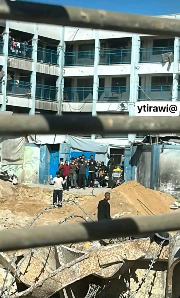 This scene seems to reflect one shared by Shorouk News via an eyewitness account. Specifically, the eyewitness reported that artillery was fired by the Israeli military after a group of civilians had gathered to prepare and leave the UNRWA-affiliated school.