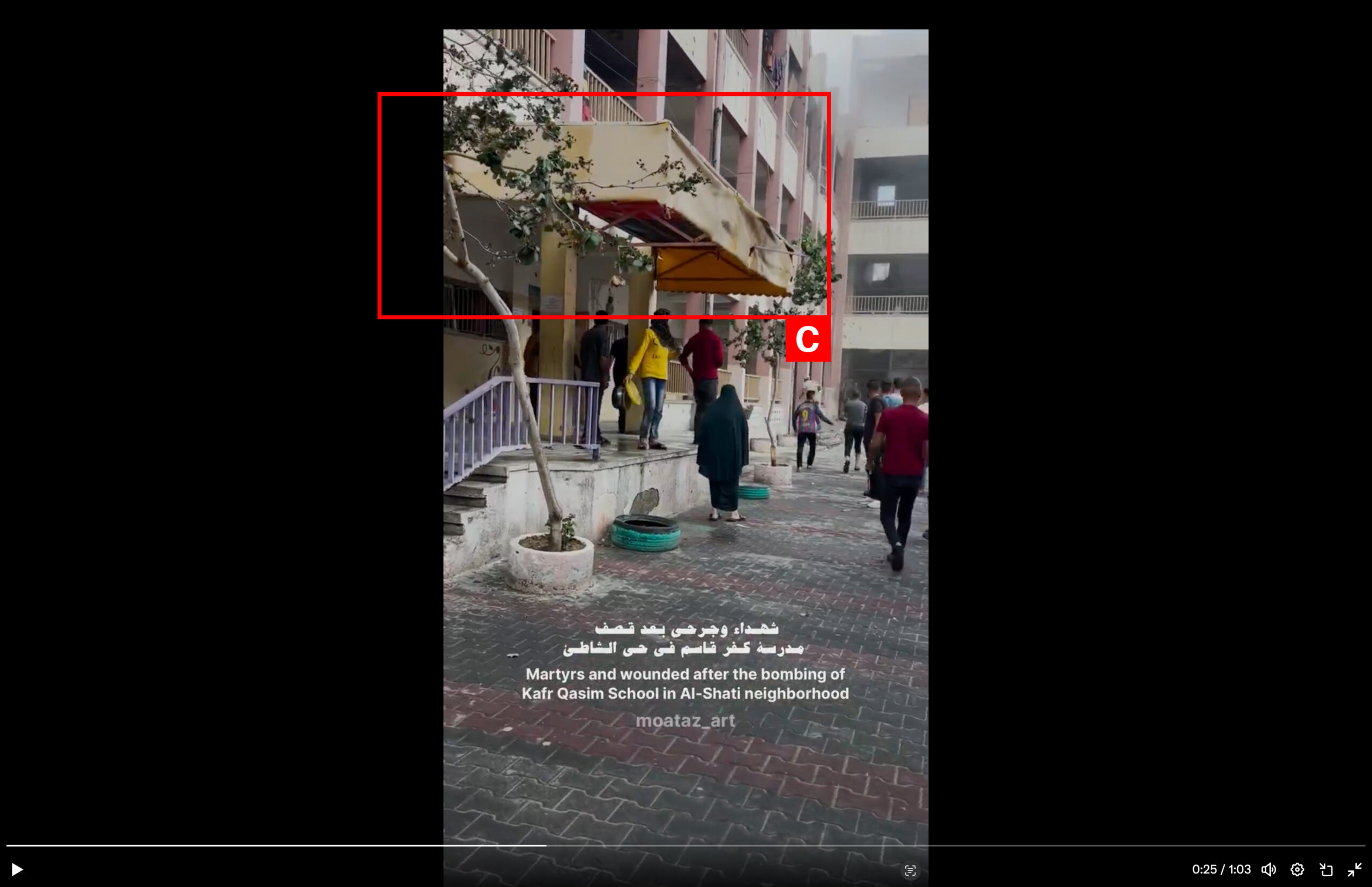 Reports of the incident mention the Kafr Qasim School (مدرسة كفر قاسم الثانوية للبنات) being struck in the Al Shati camp (مخيم الشاطئ). Analysing audio-visual material from sources, we have narrowed the location down to the following exact coordinates: 31.529556, 34.449538.