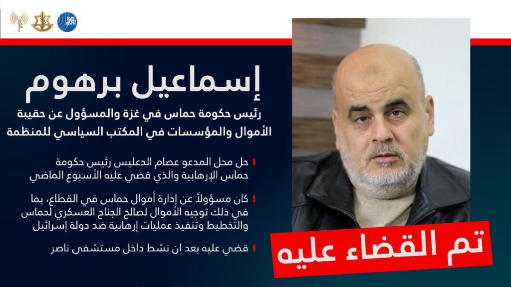 The Israel Defense Forces acknowledged the strike on Telegram, writing that “Yesterday (Sunday), the IDF and ISA conducted a targeted strike in the area of Khan Yunis, eliminating the terrorist Ismail Barhoum, head of Hamas’ finances and institutions in the terrorist organization’s political bureau.” He had been, the IDF continued, a “key figure in Hamas’ political bureau and was actively involved in the military decision-making process that directly impacted Hamas’ operations.” He had been killed “while he was operating within the “Nasser” Hospital, while cynically endangering the civilian population in the area.” The IDF also shared an infographic outlining Ismail’s activities. One of the lines notes that Ismail was the “Successor to Essam al-Daalis, former head of the Government who was eliminated last week.” Essam al-Daalis was killed in a declared strike on the pre-dawn strikes on March 18, 2025 (ISPT180325i) when Israel broke the ceasefire which had been in effect since January 2025.