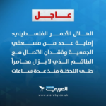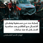 The Palestinian Information Center was the first to report the incident on its Twitter/X account @PalinfoAr at 6:59 a.m., announcing the injury of the two paramedics from the Palestine Red Crescent Society and the loss of contact with others. Twitter/X account @RassdNewsN corroborated this information by posting a statement from the Palestine Red Crescent Society: “The [Israeli] forces besieged a number of our ambulances while they were in an area that was targeted in Rafah. A number of the society’s paramedics were injured, and contact with the crew, which has been under siege for hours, has been lost.”