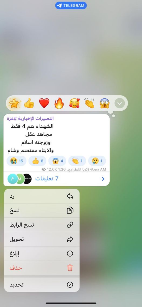 Fadwa Em Saja shared a screenshot of a previous chat conversation with Islam, captioning the post with the following: “Great sadness in my heart. My dear cousin, my second mother; the beautiful, creative Islam Abdullah Adwan, a martyr, God willing. We consider her as such and we do not vouch for anyone before God… She and her hero husband Mujahid Aql and her spoiled princess daughter Sham… May God have mercy on them all and grant us great reward, for our affliction is great and our wound is deep…”