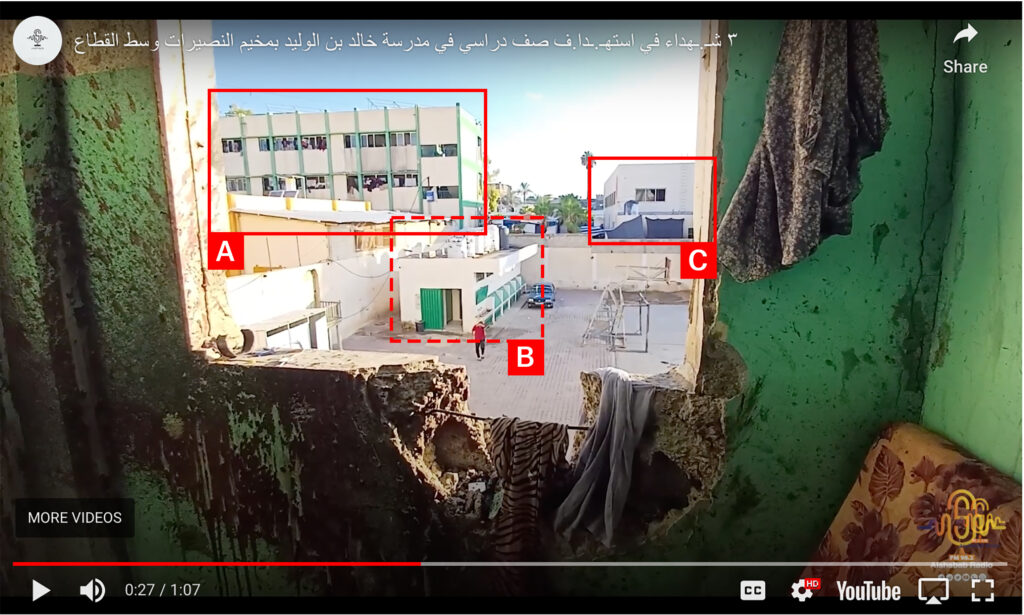 Reports of the incident mention that the Khalid bin al-Walid School (مدرسة خالد بن الوليد) was struck in the Al Nuseirat Camp (مخيم النصيرات). Analysing audio-visual material from sources, we have narrowed the location down to the following exact coordinates: 31.440966, 34.388025.