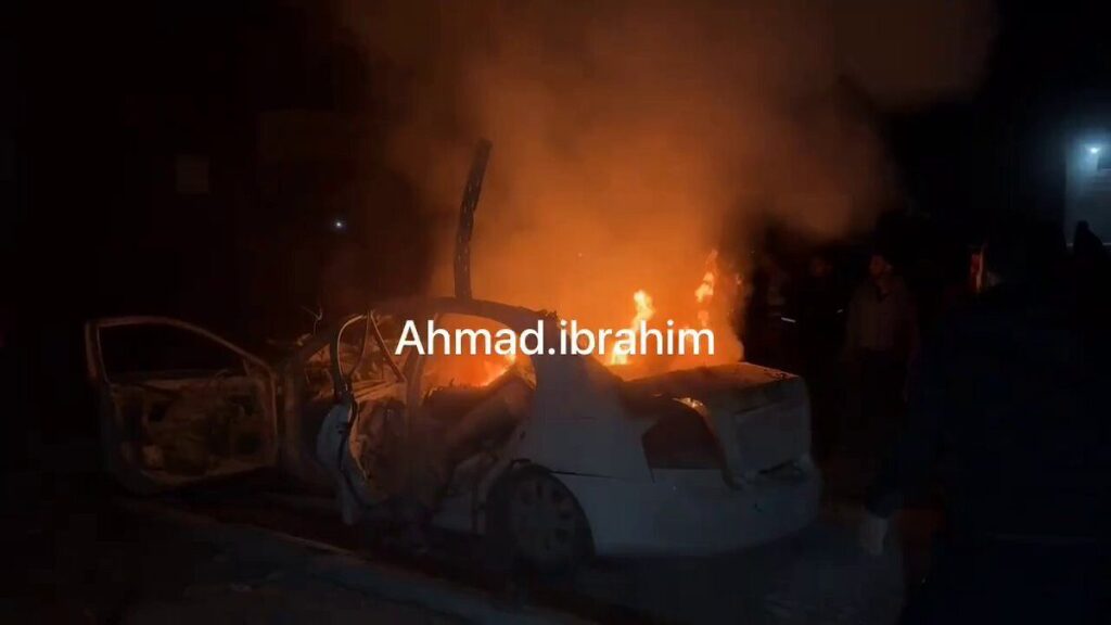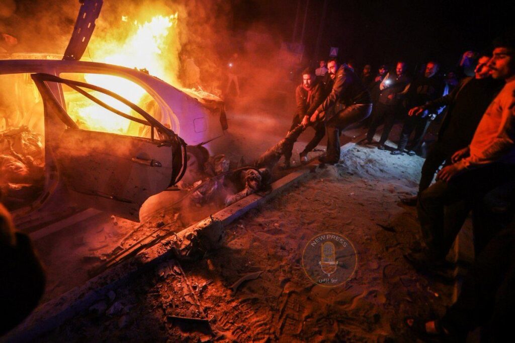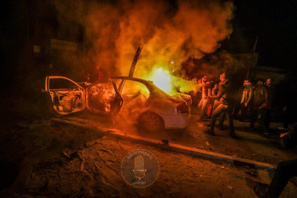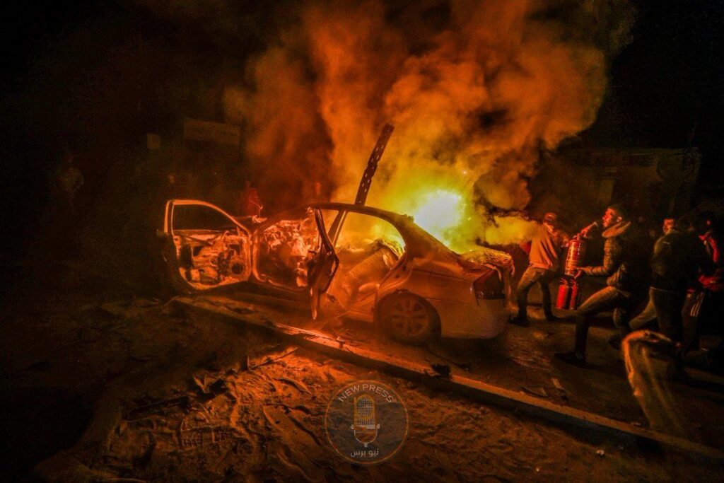 @madfajy posted a video on X/Twitter showing a blazing fire with a truck driving away and people running around the fire. The video is dark, indicating the evening time of the incident. The caption reads “martyrs and wounded in the targeting of aid workers on Salah al-Din Street in Gaza.”