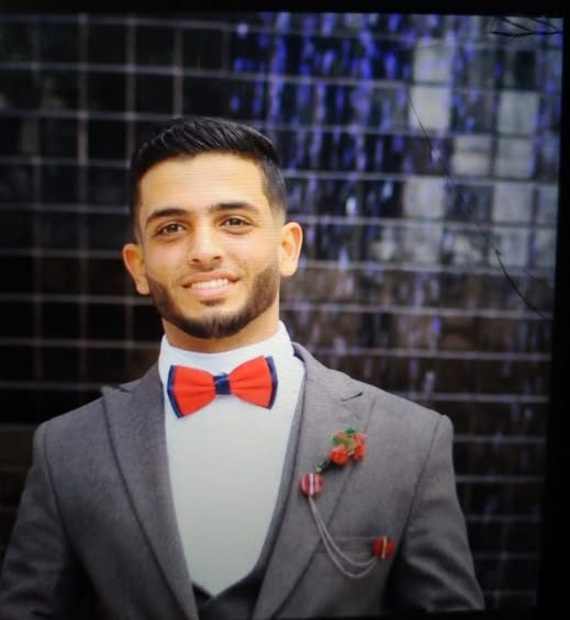 One photo shared shows 22-year-old Salman Ahmed Salman Abu Ghraba, a young man with styled black hair and a black beard, wearing a blue patterned button-down with short sleeves. He is wearing a silver watch on his left wrist and navy pants. He is smiling in the photo.