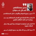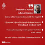 Several news outlets quoted the director of Kamal Adwan Hospital, Hussam Abu Safiya, who, speaking from on the ground, reported that the hospital was in a “critical” condition. In an urgent post, Aljazeera Channel quoted Hussam Abu Safiya, who reported that “all barriers and doors inside the hospital” were destroyed and “20 people” were injured, “including 5 medical staff”. In another post made by Al Jazeera Egypt, Hussam Abu Safiya is reported as saying that generators were also hit, making the situation “critical”.