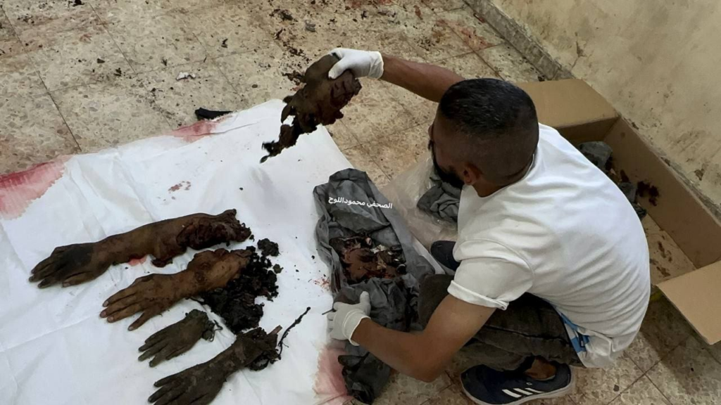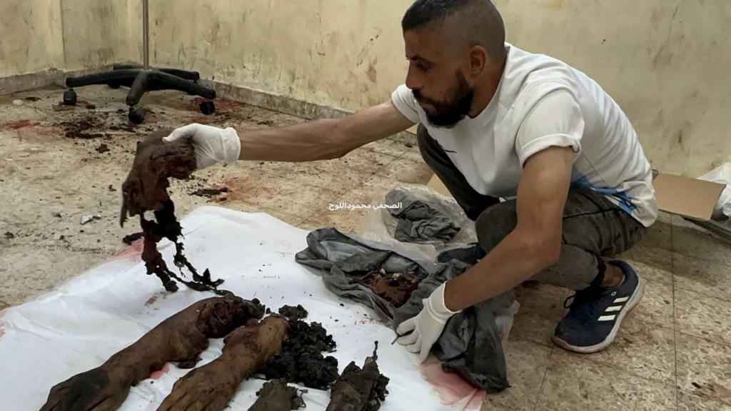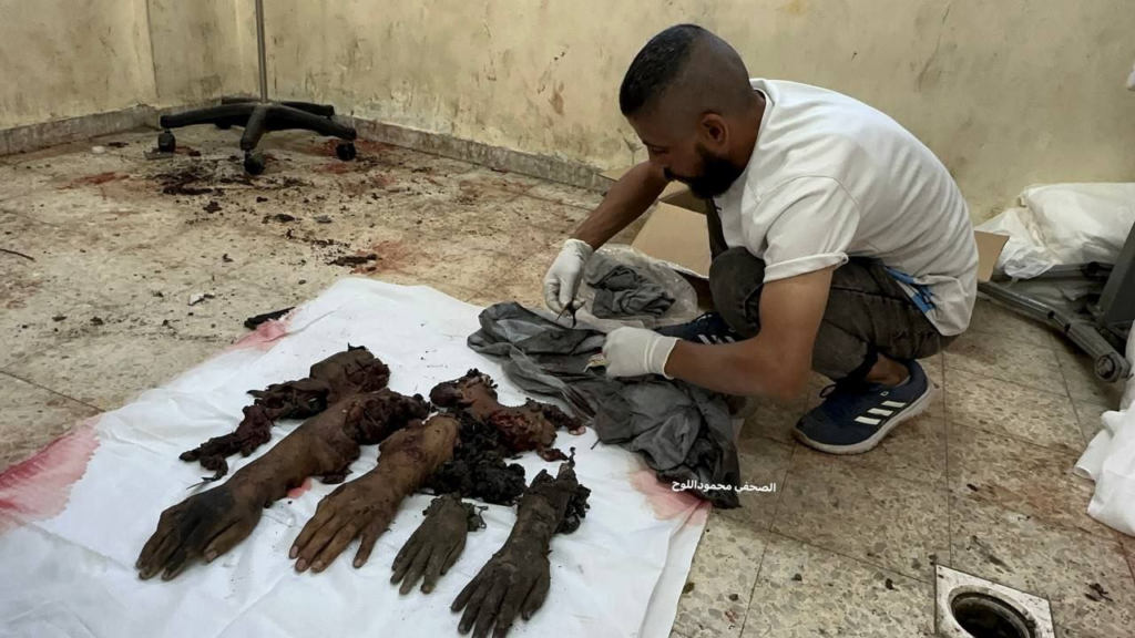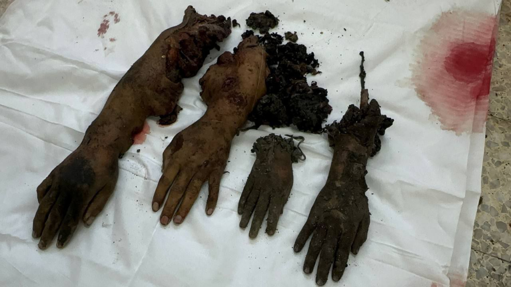 @khaberni on X/Twitter further demonstrated the devastation to human life, posting graphic photos of dismembered limbs from the deceased, including the arms of children, who arrived at the Al-Awda Hospital as a result of the bombing. The dismembered limbs were burned from the strike. A man in gloves holds a piece of burned flesh that was seemingly attached to one of the arms.