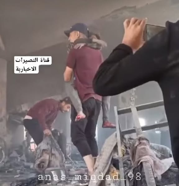 @Ajmubasher on X/Twitter reported “at least 17 martyrs and 32 wounded as a result of targeting the Shuhada al-Nuseirat School, which houses displaced people” in Nuseirat camp. Included is a video of the devastation after the bombing – the deceased covered in blankets amongst the rubble, with fires burning as remaining civilians run frantically trying to find survivors or move the deceased.