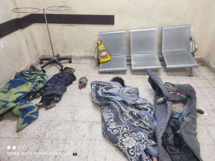 Mohamed Abd El-Razek on Facebook shared a picture of three of the children who were killed, with a fourth figure on the left – all are wrapped in blankets on the floor and one of the children’s bodies that was visible was covered in dust. In between two of the bodies was a dismembered hand.