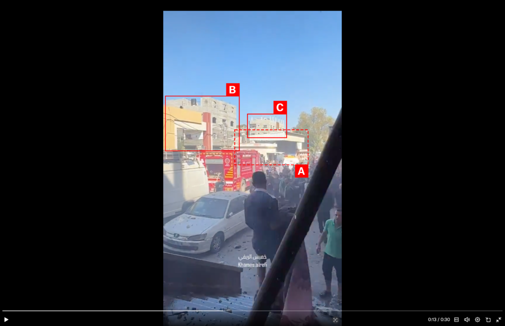 Reports of the incident mention the “Martyrs” School (مدرسة شهداء النصيرات) being struck in the Nuseirat camp (مخيم النصيرات). Analysing audio-visual material from sources, we have narrowed the location down to the following exact coordinates: 31.448364, 34.385692.