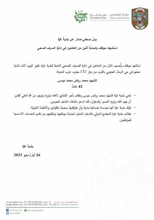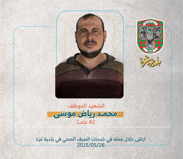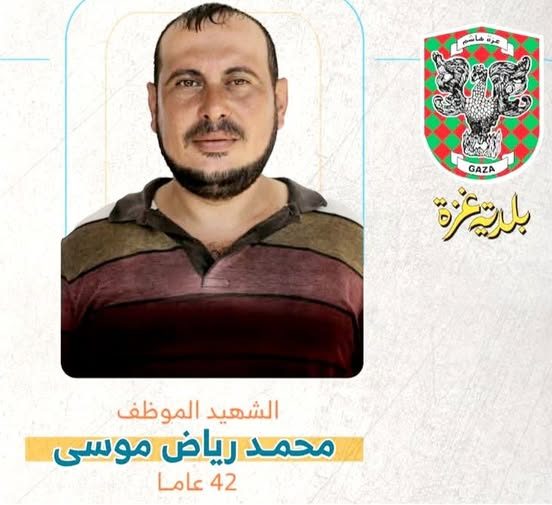 The victim was identified as 41-year-old Mohammed Riyad Mohammed Musa, a municipal employee working in the sewage services department. The Gaza Municipality confirmed his death, stating that he was killed while performing his professional duties. Two of his colleagues were also injured in the same incident, though their names have not been publicly disclosed. According to his profile on the website Genocide in Gaza, he was performing his work in sanitation services when he was attacked without a prior notice.