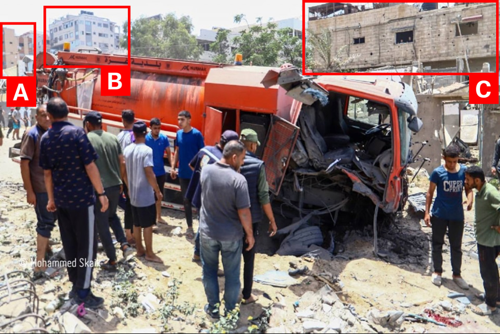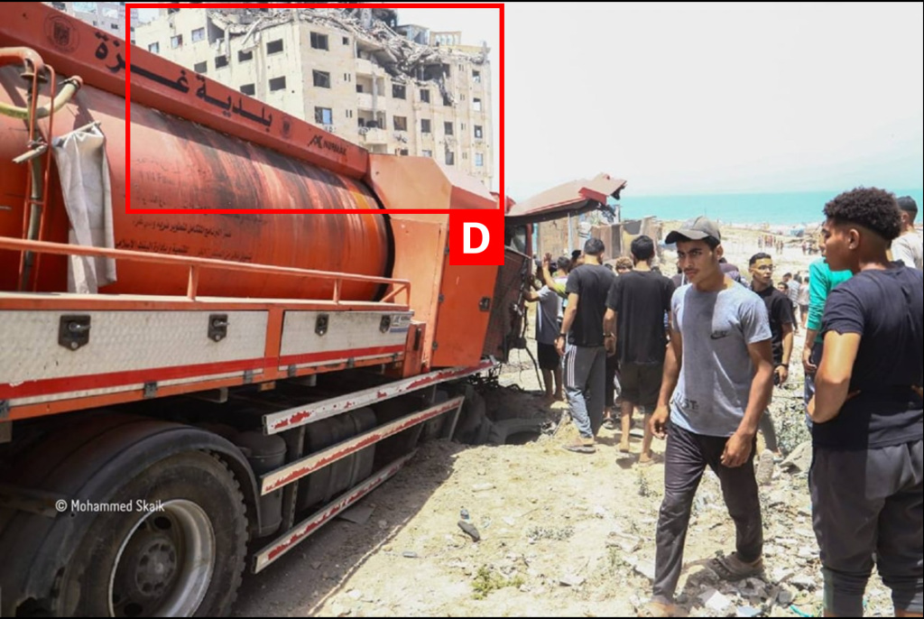 Multiple reports from Shehab Agency, PalinfoAr, and @refugeesps confirmed that the municipal vehicle was bombed while on duty. Images from the scene showed the truck bearing municipal markings, heavily damaged at the Ezbet al-Hamamiya intersection.