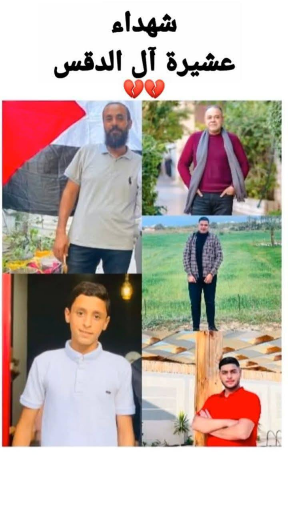 52-year-old Yasser Muhammad Salama al-Daqs was killed alongside his 41-year-old wife Shireen Abdul-Aziz al-Daqs (Baroud) (Umm Waleed), their sons, 20-year-old Waleed Yasser Muhammad al-Daqs and 18-year-old Muhammad Yasser Muhammad al-Daqs, and their daughters, 21-year-old Maria Yasser Muhammad al-Daqs and 16-year-old Razan Yasser Muhammad al-Daqs.