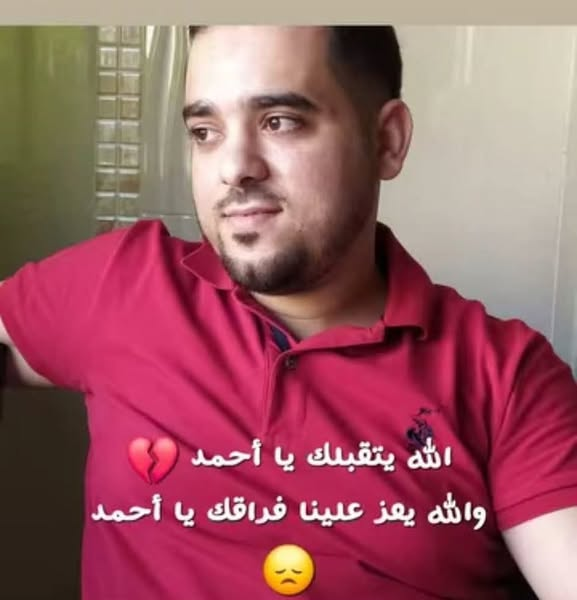 Abdallah Samour posted about the death of his cousin, Dr. Ahmed Samour, wishing “May God have mercy on him and accept him as a martyr in the field of serving his people.” He added an image of Ahmed, a young man with a round face, big eyes, and a gentle smile, wearing a red polo T-shirt.