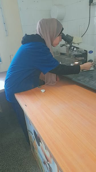 The Facebook post by Eid Sabbah contained the image of Israa Abu Zaida, a young woman dressed in a dark green T-shirt and a beige hijab, looking into a microscope.