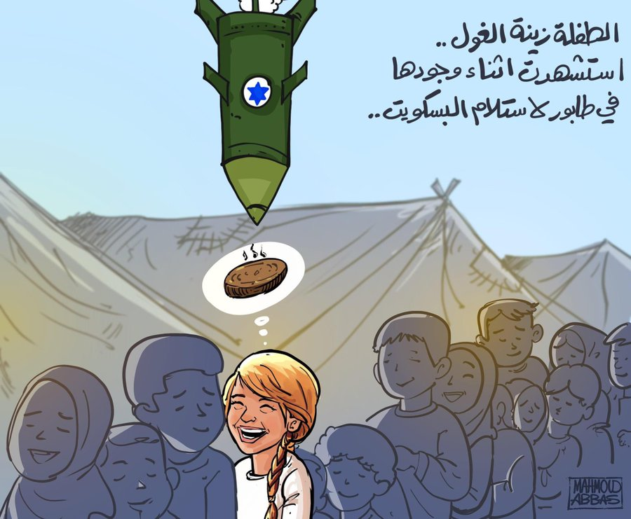 Among the confirmed fatalities was nine-year-old Zeina Saeed (Abd al-Karim) al-Ghoul, a young girl killed while waiting in line to receive food. Multiple Twitter users, including @Mahmoud3bbas, @AnasAlSharif0, and @ZaidAlsalman6, reported: “Zeina Al-Ghoul was martyred while lining up to receive a biscuit meal in Asmaa School.” A photograph of Zeina was widely shared, showing a young girl with a wide smile, hugging a toddler.