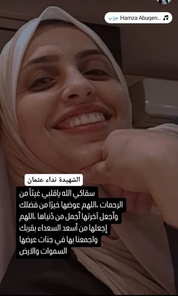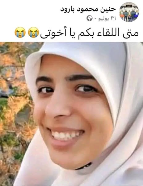 Iman Al Atal, remembering Nadia Emad al-Sayed, as well as her sister, Saja Ahmed al-Atal, and sister-in-law, Nidaa Othman al-Atal, wrote that “Paradise is only suitable for people like you.” They were “dear friends and the loves of my heart, whom my eyes are accustomed to seeing every morning.” Iman attached photographs, including one of Saja in a black hijab and a smiling Nidaa in a white hijab. “O god,” the caption on Nidaa’s photograph states, “make her one of the happiest of the happy.”