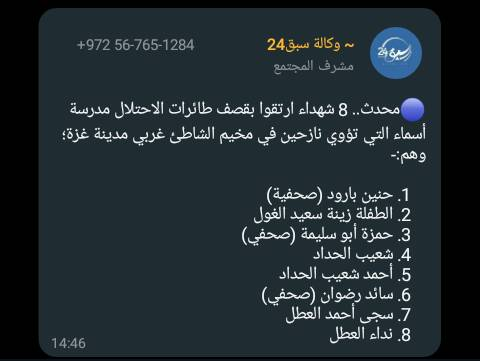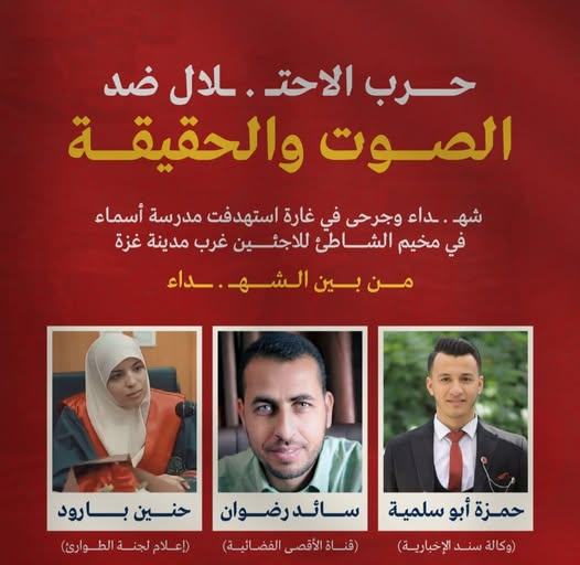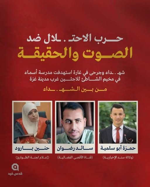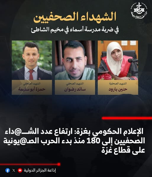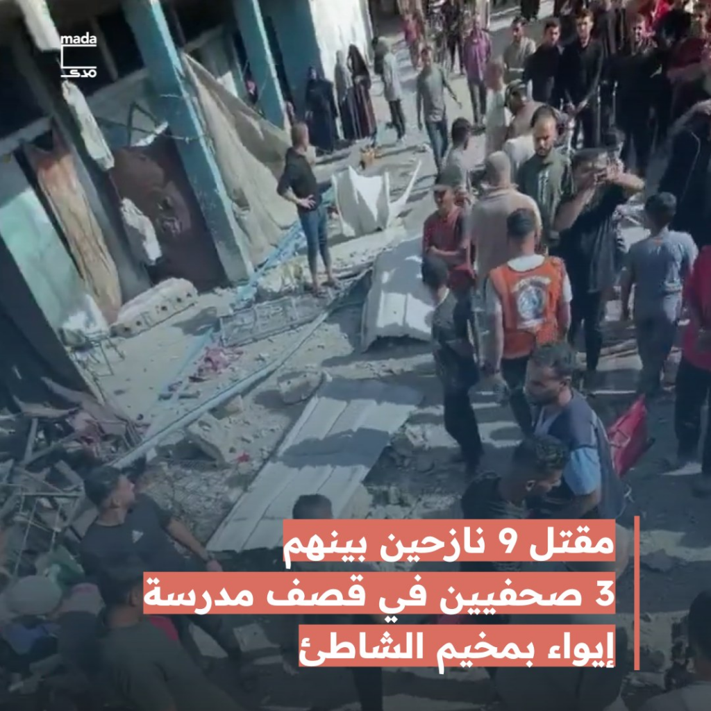 On Facebook, Mada News Agency confirmed that nine displaced persons had been killed. A statement from the Palestinian Journalists Syndicate (Facebook) condemned the strike, calling it “a new massacre against journalists,” and added that this incident brought the total number of journalists killed since the beginning of the war to approximately 180.