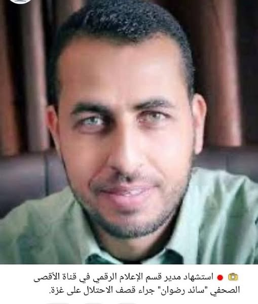 41-year-old Dr. Saed (Saed Mohmmad) Radwan, Director of the Digital Media Department at Al-Aqsa TV, was also killed. Facebook posts by Mahmoud Emad and Dr. Saad Kareem recalled his media leadership and mentorship of students at Al-Isra University, while Basema Al Farra reported that he held a “doctor[ate] in artificial intelligence” and “gave and gave from his knowledge and experience to media students in universities and training center.” Mahmoud Emad shared that he had spoken to Radwan earlier that morning, and Radwan had warned him: “All places are not safe.” Alaa Alaa (Twitter) referred to Saed as “the brave, the owner of a smile that never left his face.” He can be seen in images shared wearing a light green shirt. Saed was reported to be the brother of Sami Radwan, a former Hamas commander who was killed during the 2021 Hamas-Israel conflict.