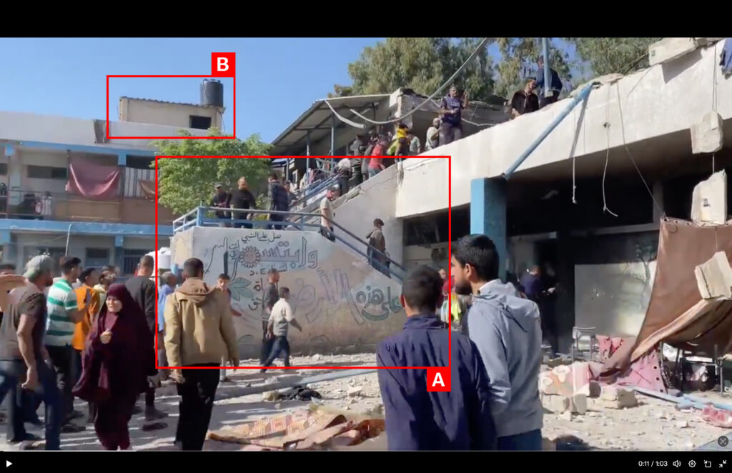 Reports of the incident mention the Asmaa School (مدرسة أسماء) being struck in the Al Shati camp (مخيم الشاطئ). Analysing audio-visual material from sources, we have narrowed the location down to the following exact coordinates: 31.528797, 34.448447.