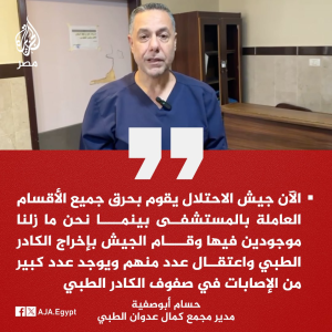 @Dr_Muneer1 on X/Twitter shared a screenshot of Dr. Hussam’s Instagram story, which said, “Now the [Israeli] army is burning all the operating departments in the hospital while we are still there. The army evacuated the entire medical staff and displaced people and arrested a number of the medical staff. There are a large number of injuries among the medical staff.”