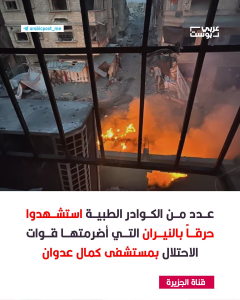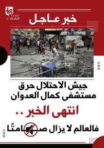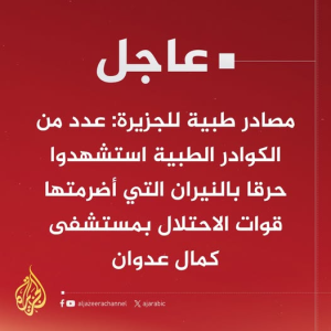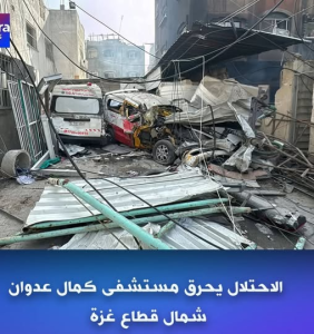 According to Al Jazeera on December 27th, “a number of medical personnel were burned to death in the fire set by the [Israeli] forces in Kamal Adwan Hospital.” Safa News provided similar information about the incident at 21:55.