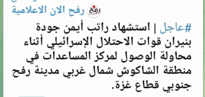 Within a few minutes of the @PalinfoAr post, Alyamnews posted to Facebook, writing that Rateb Ayman Joudeh was “martyred by Israeli occupation forces fire while attempting to reach an aid center in the Shakoush area, northwest of Rafah, in the southern Gaza Strip.”