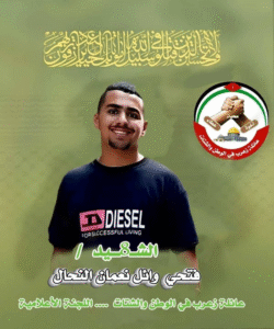 The Facebook account ‘News of the Za’rab family in the homeland and diaspora’ also shared the news of Fathi’s death, and offered “sincere condolences to our brothers and loved ones in the “Al-Nahhal” family for the martyrdom of their son”. The account also shared a martyr’s image of Fathi, which shows Fathi in his Diesel shirt, along with his name and the family’s crest.