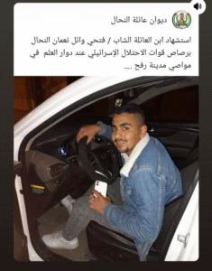 Fathi’s cousin, Samah Zaid, shared the same image of Fathi, and offered a prayer, writing “We belong to Allah and to Him we shall return. May Allah have mercy on you, Fathi”, adding “My cousin is a guest of the Most Gracious. The young man from the family, Fathi Wael Noman Al-Nahhal, was martyred by the bullets of the Israeli occupation forces at the Al-Alam roundabout”.