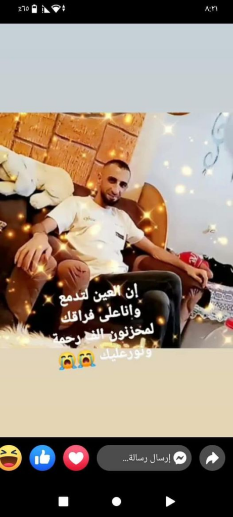 The death of the four young brothers and/or cousins, Muhammad, Magdy, Marwan and Majid, was mourned in a post by Ali Abed who extended condolences for the Abu Abdo family. Abu Alnamr Abdo wrote about the deceased men: “Your good memory will remain in our words, hearts and eyes”. He shared that Majid was planning to give a ring to his fiancée and make her “happy” while Muhammed used to bring food to feed his wife and children. Marwan was a Bedouin who used to work as a fisherman; his “livelihood was cut off” due to the “occupation” and his displacement.