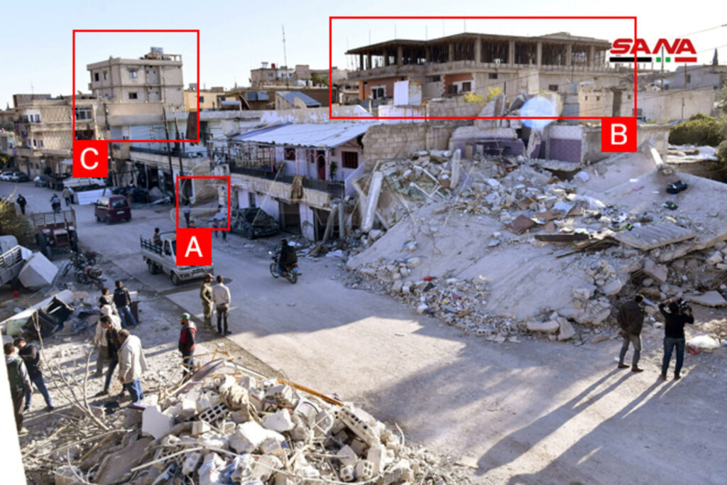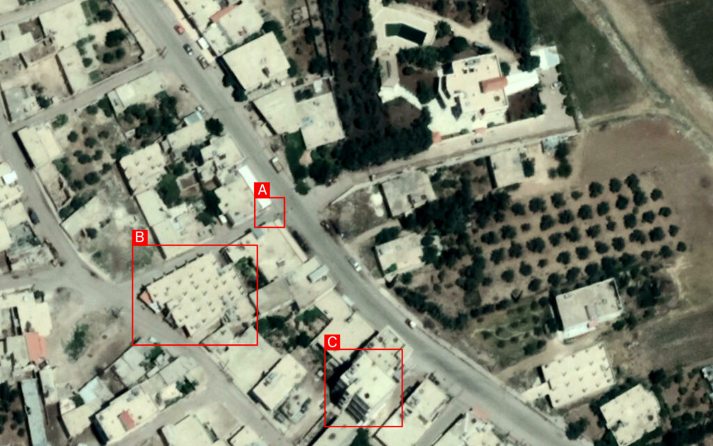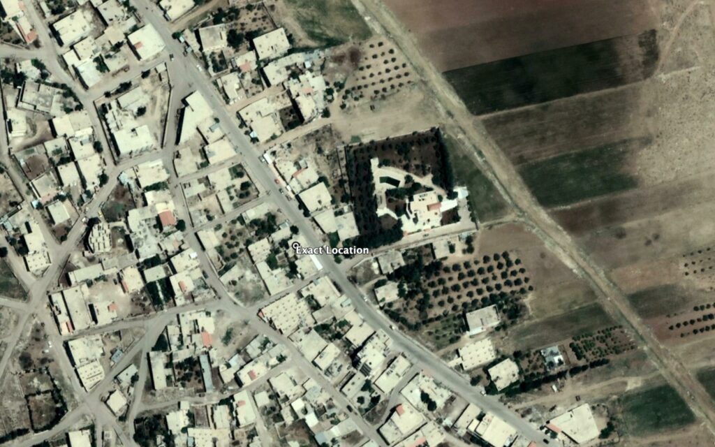 Reports of the incidnet mention a residential building being struck in the village of Beit Saber (بيت سابر). Analyzing audio-visual material from sources we have narrowed down the location to these exact coordinates: 33.328061, 36.000645.