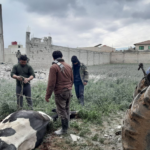 Another picture shows a semi-urban site with buildings on the horizon; a cloud of smoke was coming out of the building complexes. The last picture showed four men standing in front of a dead cow, lying on the ground. In the background, one could see a gray brick wall, with one of its sections completely destroyed and others damaged. One man was standing on the ruins of the destroyed section; while standing the man was as high as half of the wall.