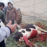 Facebook user Al-Awda Sports’ team shared pictures related to the event on the platform. One of the pictures showed a rural site with a group of houses in the second half of the picture; a big white and gray cloud of smoke was coming up from the inhabited site. Another picture showed three men standing in front of a tractor in a rural area; in front of them, there was a cow lying on the ground, seemingly dead.