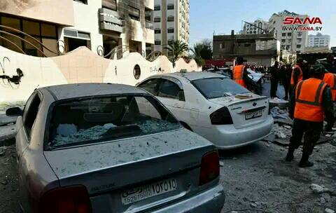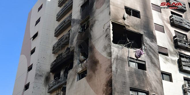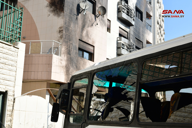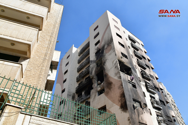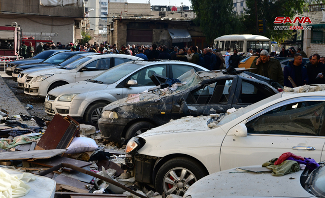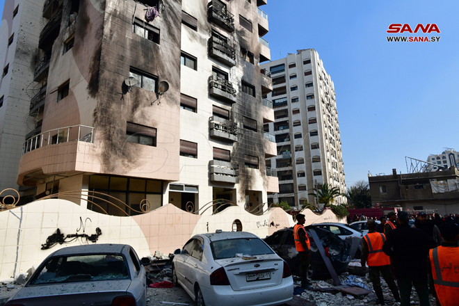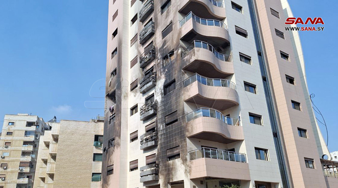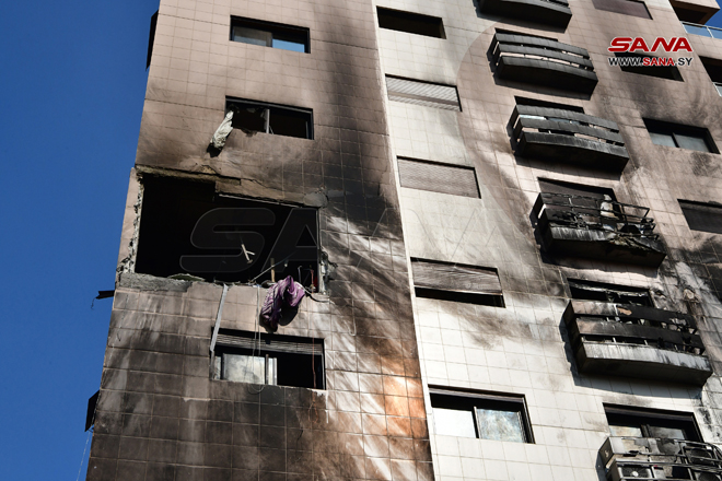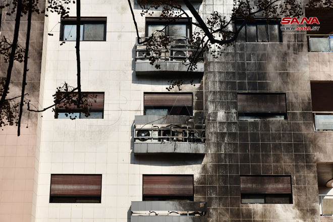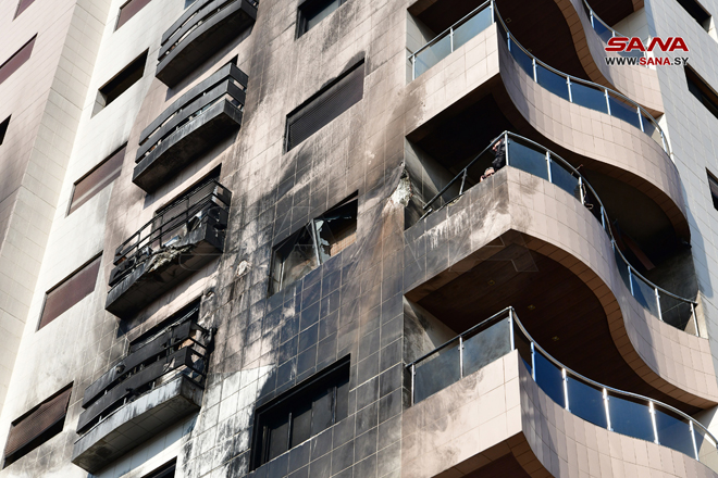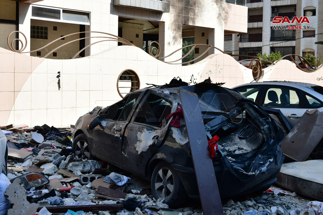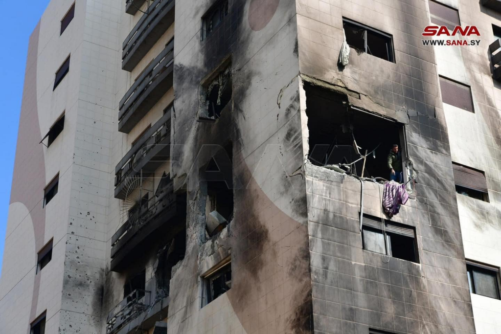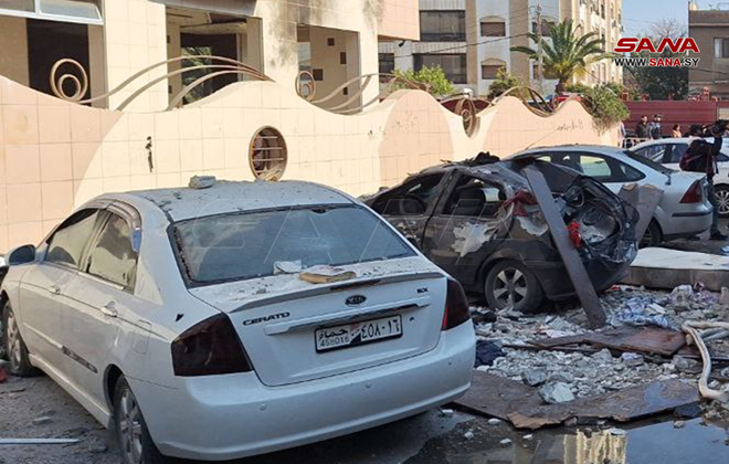 Several photos and videos shared by SANA news and other sources captured the damage to the Orfali residency, a building in white and beige colors with at least ten stories, and balconies with a curved design. The overall structure was not destroyed, but some apartments sustained visible damage, and traces of the attack were evident on the walls. The material damage spread to nearby vehicles, particularly to buses and vans belonging to the Al-Bawader kindergarten, and to civilian cars. Some building units had broken windows and some others had significant dents from debris.