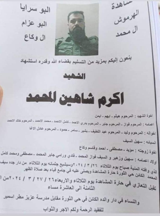 While the WHO reported that Imad Shihab was killed due to being in a building that was hit during a series of airstrikes, Euphrates Post and Furat Post reported that it was “a result of shrapnel from one of the missiles falling on their homes adjacent to the villa” that was hit. Deir Ezzor posted that “his house is located next to his brother’s house, which the militias seized earlier and turned into their headquarters.”