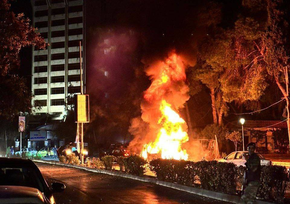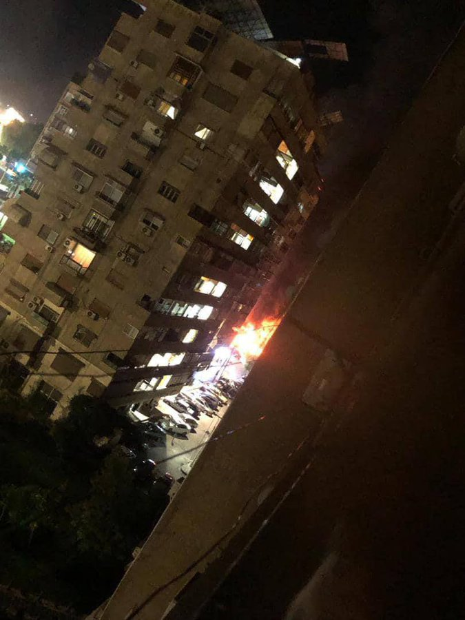 Twitter/X user @Mohammad_awad90 shared an image reportedly related to the event showing a nighttime urban scene dominated by a fiery explosion in the foreground. Flames rose high into the air, casting a yellow-orange glow that illuminated nearby objects and trees. The fire appeared to emanate from a vehicle engulfed in flames, with thick smoke billowing upwards. To the left of the fire, a multi-story building stood prominently, partially lit by the fire and streetlights. The building showed no immediate visible damage. In the background, trees partially obscured the scene, their branches illuminated by the blaze. On the right side of the image, a man dressed in what appears to be a military or security uniform stood near a white car.