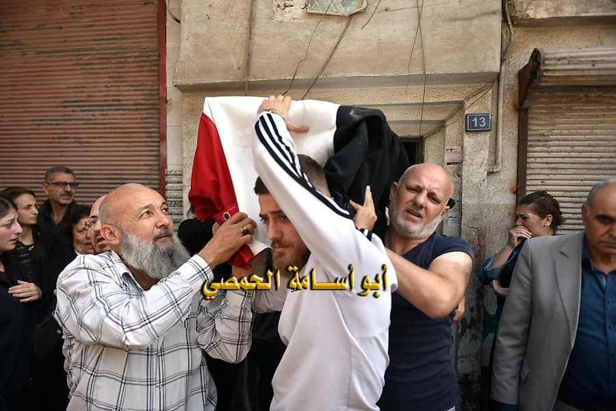 Facebook user Samer Alshamaly shared a series of pictures related to Safaa’s funeral. One picture showed a group of mourners gathered at the doorway of a residence. Two young men, dressed casually, were seen lifting a casket draped in a flag, partially visible in red, white, and black. The somber scene was intensified by the presence of a grieving woman, who raised her hand toward the casket in a gesture of farewell or despair. Other mourners, including older men and women, surrounded the doorway, their faces marked with sorrow and grief.