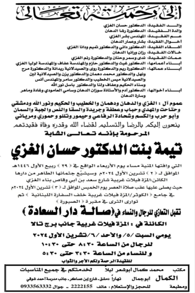 The attack reportedly took the lives of the two twin sisters, Taima al-Ghazi and Dana al-Ghazi, daughters of Dr. Hassan Hisham al-Ghazi and Dr. Rasha al-Dahan. According to some sources, Taima al-Ghazi died the day of the airstrike that hit a residential building in the Mezzeh neighborhood in the western part of Damascus. Dana al-Ghazi reportedly passed away the following day as a result of her injuries sustained by the airstrike. According to the Facebook post by Muhammad Wis, Taima was visiting her grandmother at the time of the strike.