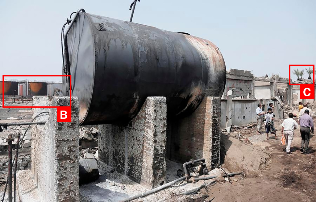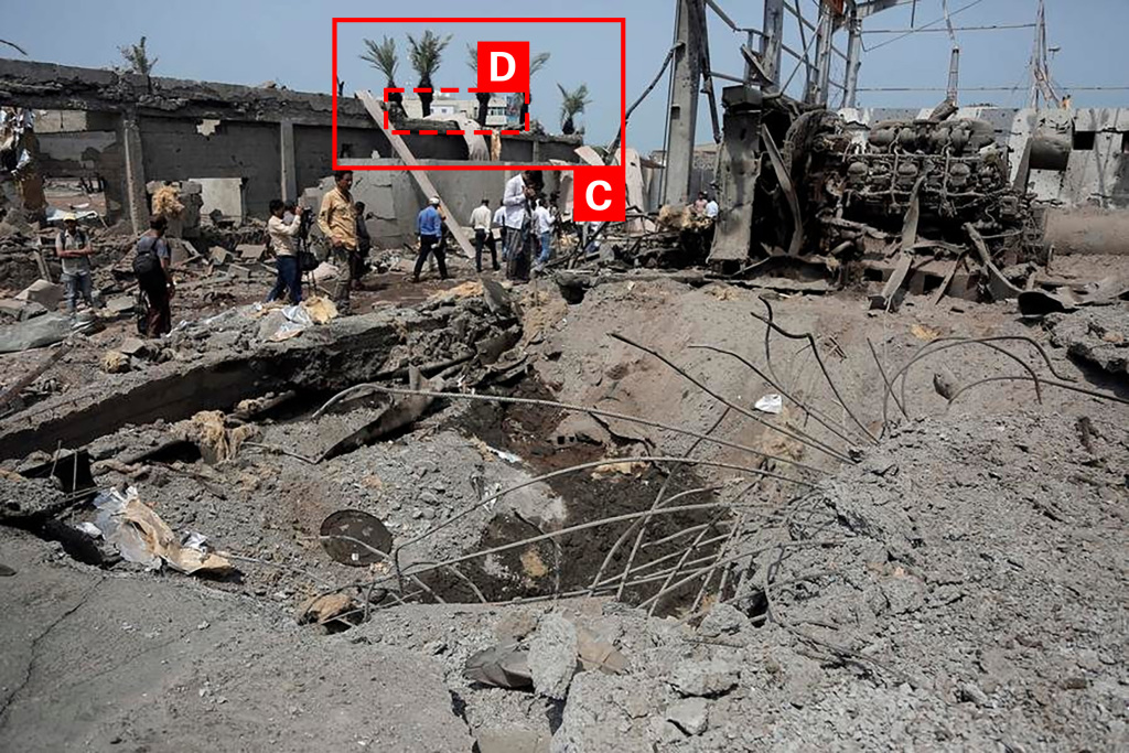 Reports of the incident mention the Al-Hudaydah Port being struck (ميناء الحديدة). Analysing audio-visual material from sources, we have narrowed the location down to the following exact coordinates: 14.831388, 42.935965.